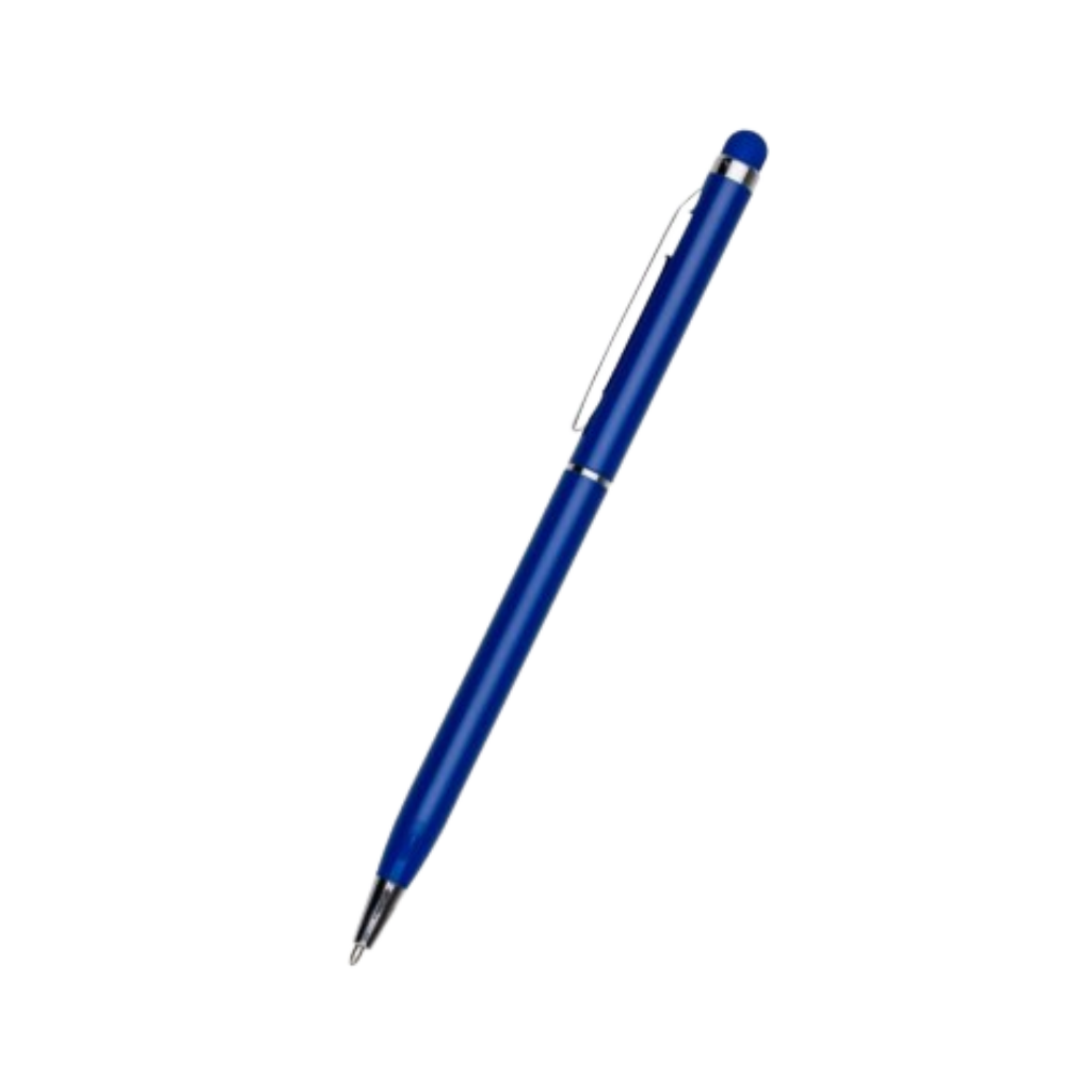 Caneta metálica com touch screen, carga esferográfica azul 1.0 mm e acionamento por rotação.